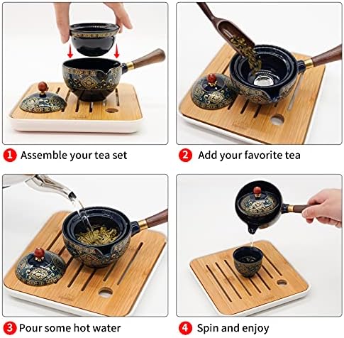 Czajniczek 360° obraca się wokół osi, pojemność 180 ml. Zaparzacz ceramiczny z sitkiem 0,5 mm. Dwie czarki 50 ml z grubością ścianki 3 mm. Torba z neoprenu izoluje temperaturę do 2 godzin. Porcelana wypalana w 1320°C, wzór floralny ręcznie malowany. Zestaw waży 650 gramów w etui. Idealny na piknik lub biuro. Czyszczenie w wodzie 50°C z miękką gąbką.